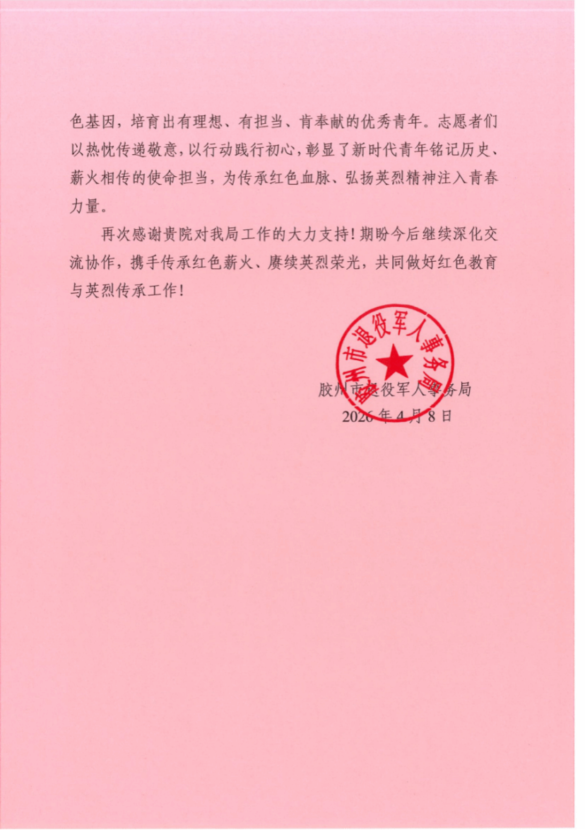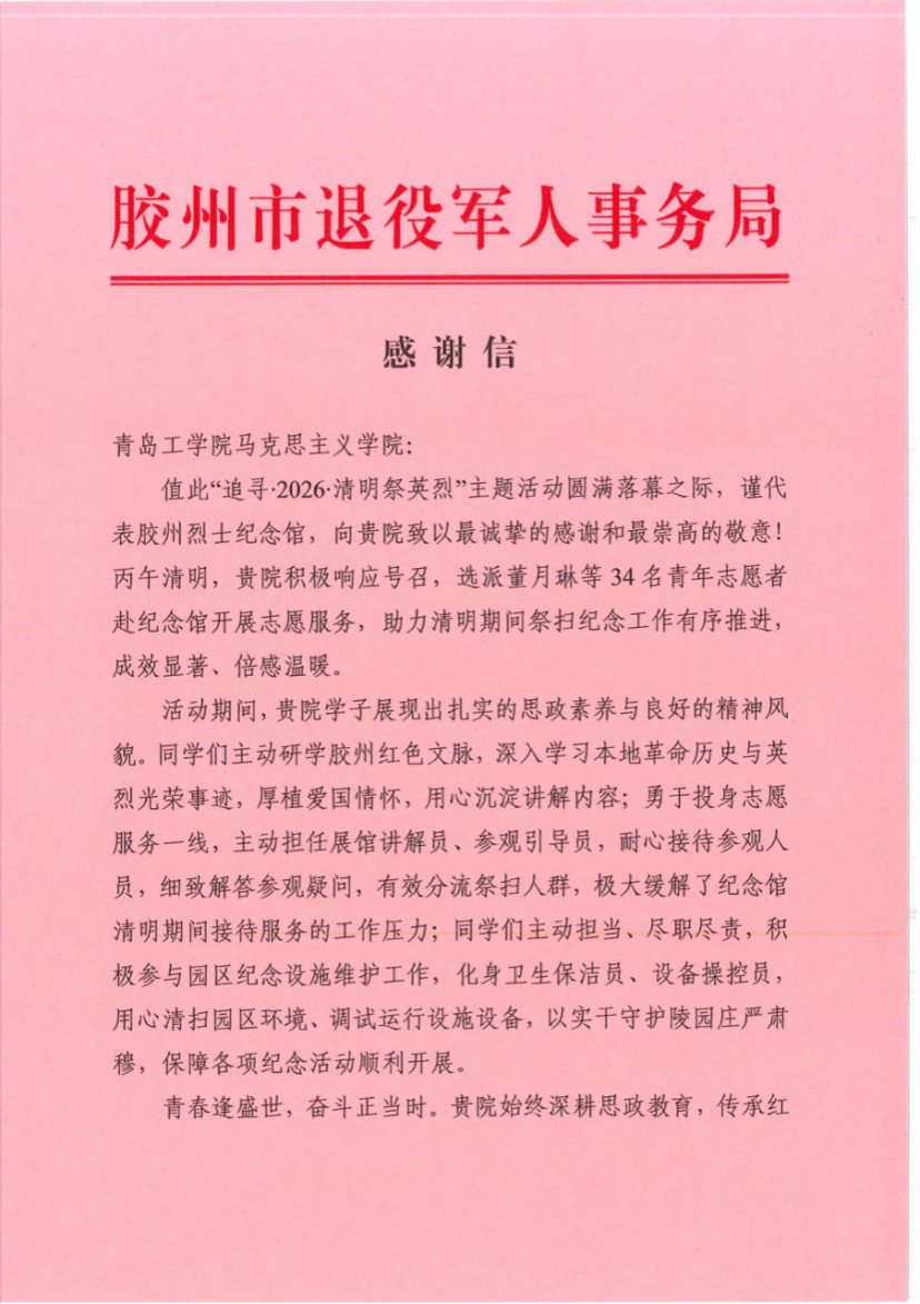赓续红色血脉,筑牢信仰之基。在开展“追寻·2026·清明祭英烈”主题志愿活动后,2026年4月8日,马克思主义学院收到了胶州市退役军人事务局针对本次志愿活动的感谢信,这是继2025年我院首次开展“清明祭英烈”活动后,再次收到感谢信,这份认可为学院思政实践工作注入了强大动力。