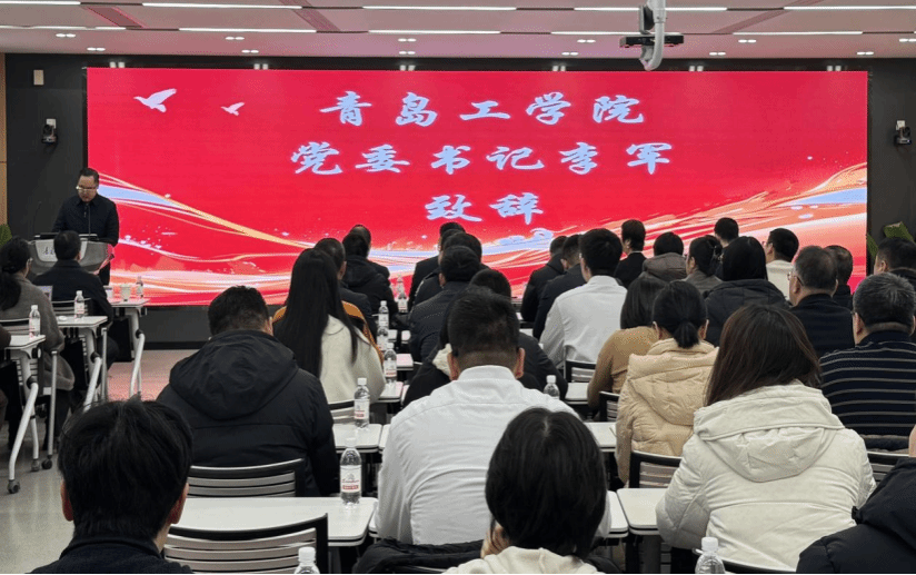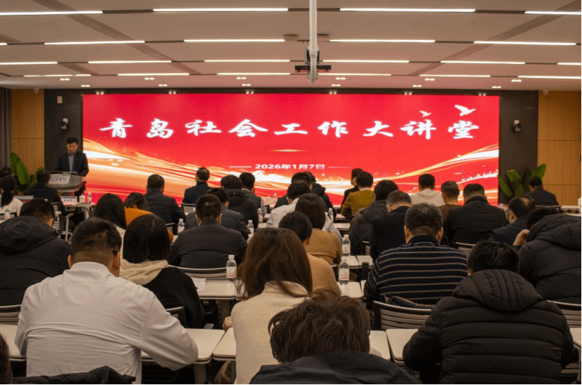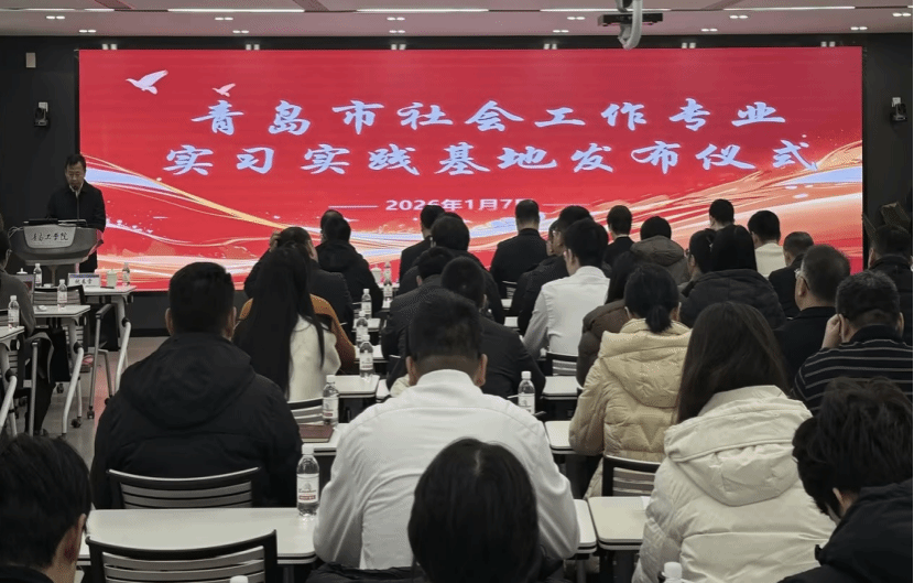 为深化校地协同创新、推进社会工作高质量发展,2026年1月7日,青岛社会工作大讲堂暨青岛市社会工作专业实习实践基地发布系列活动在青岛工学院正式启动。活动由青岛市委社会工作部副局级领导干部何世苏和胶州市委社会工作部副部长、市委“两新”工委书记祝春雷主持,中国社会工作教育协会会长、北京大学社会学系教授、博士生导师马凤芝教授和青岛理工大学人文与外国语学院副院长兼社会工作硕士教育中心主任杨书胜教授作专题授课,青岛工学院党委书记李军、校长刘连新和副校长李占军出席。